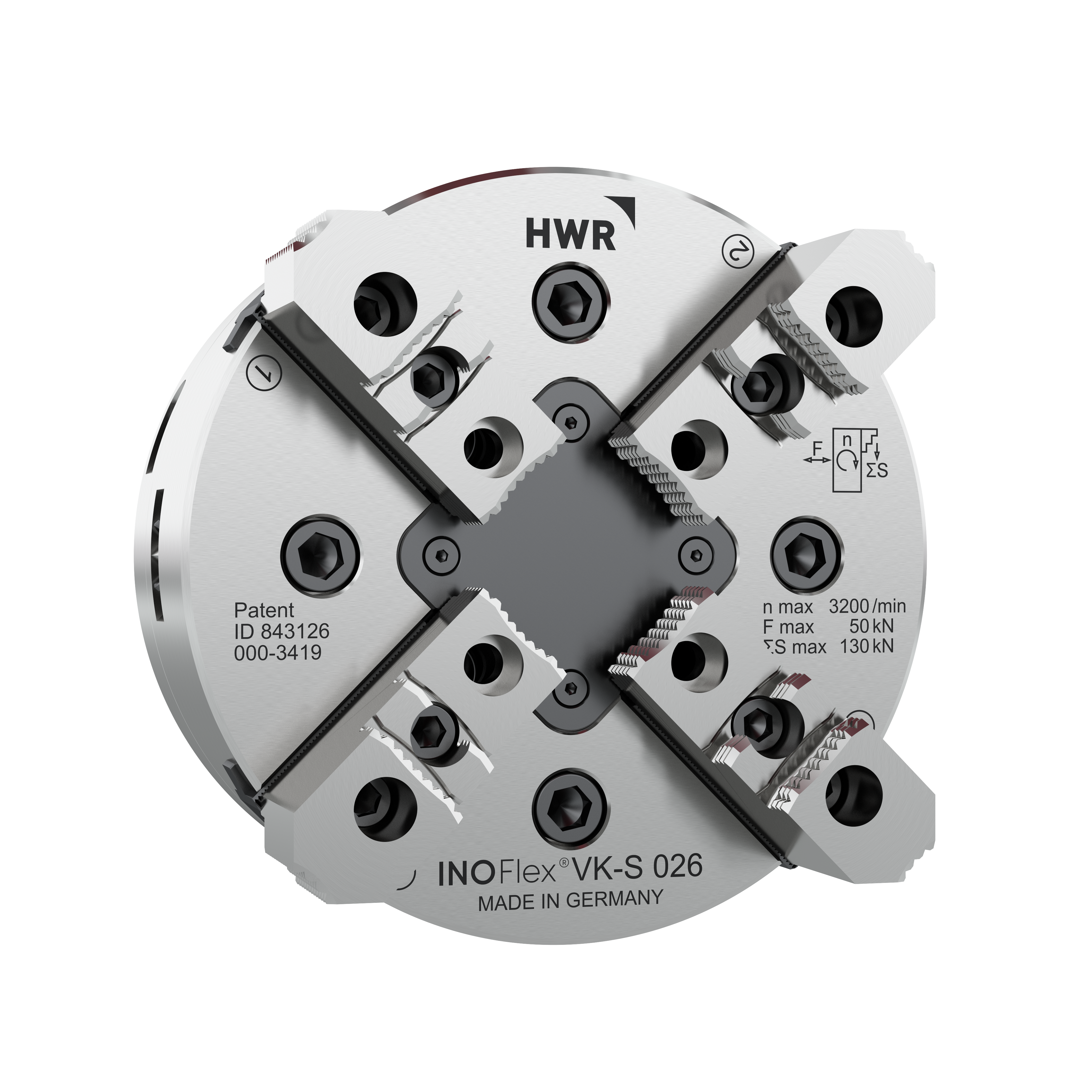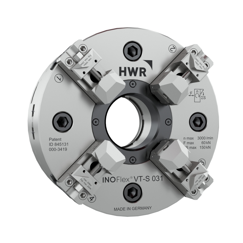 Met de InoFlex® 4-klauw klauwplaat met unieke krachtcompensatie kunnen werkstukken in ronde, rechthoekige en zelfs onregelmatig gevormde werkstukken gecentreerd worden opgespannen. Door het unieke ontwerp is de spankracht op alle vier de klauwen altijd gelijk.
